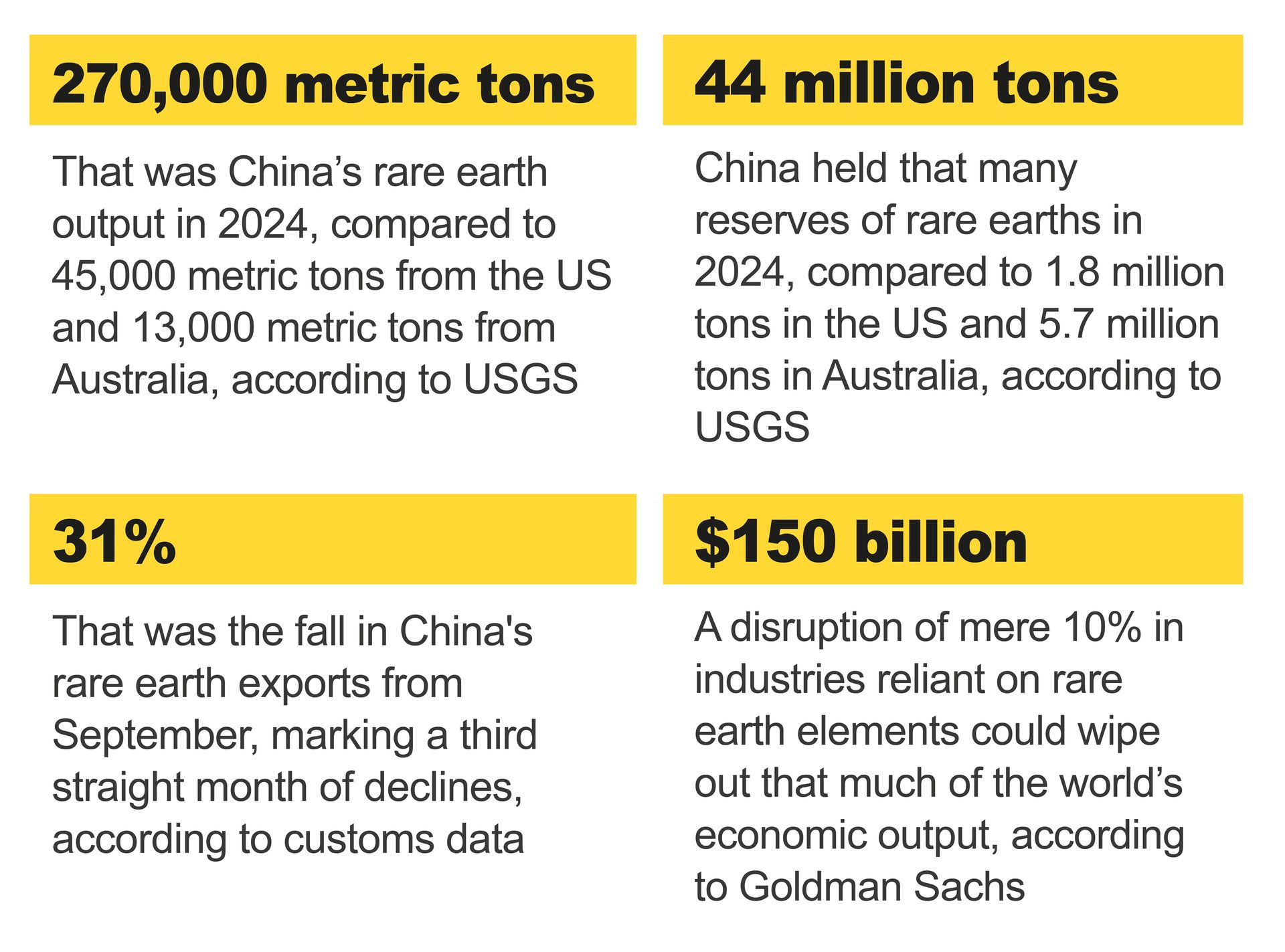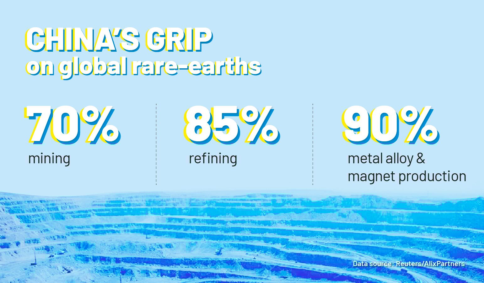 But such is the power of rare earths. This group of 17 elements (with tongue-twisting names) has a profound grip on the world’s most critical industries: be it consumer electronics, military hardware, medical imaging, electric vehicles or other green technologies. And China dominates their processing and refining. The rare earth magnets it creates in the process are just as vital for most modern technologies. "We have millions of these little magnets in every little motor we use — even little motors in our razors,” one expert told Australia’s ABC News, describing their importance.